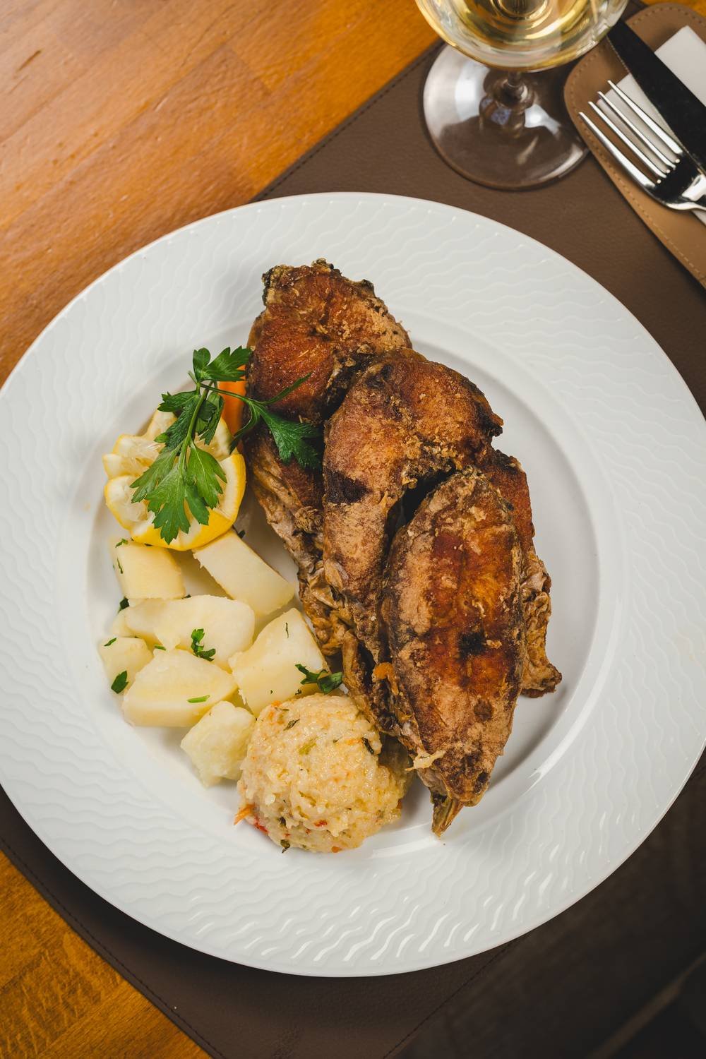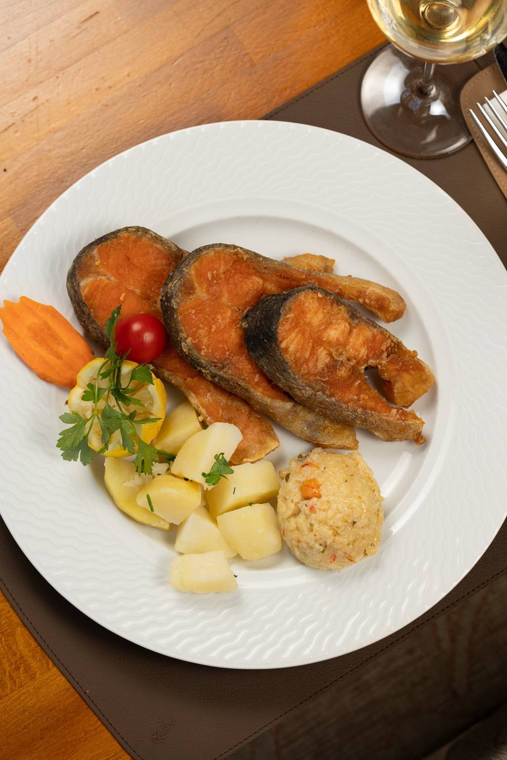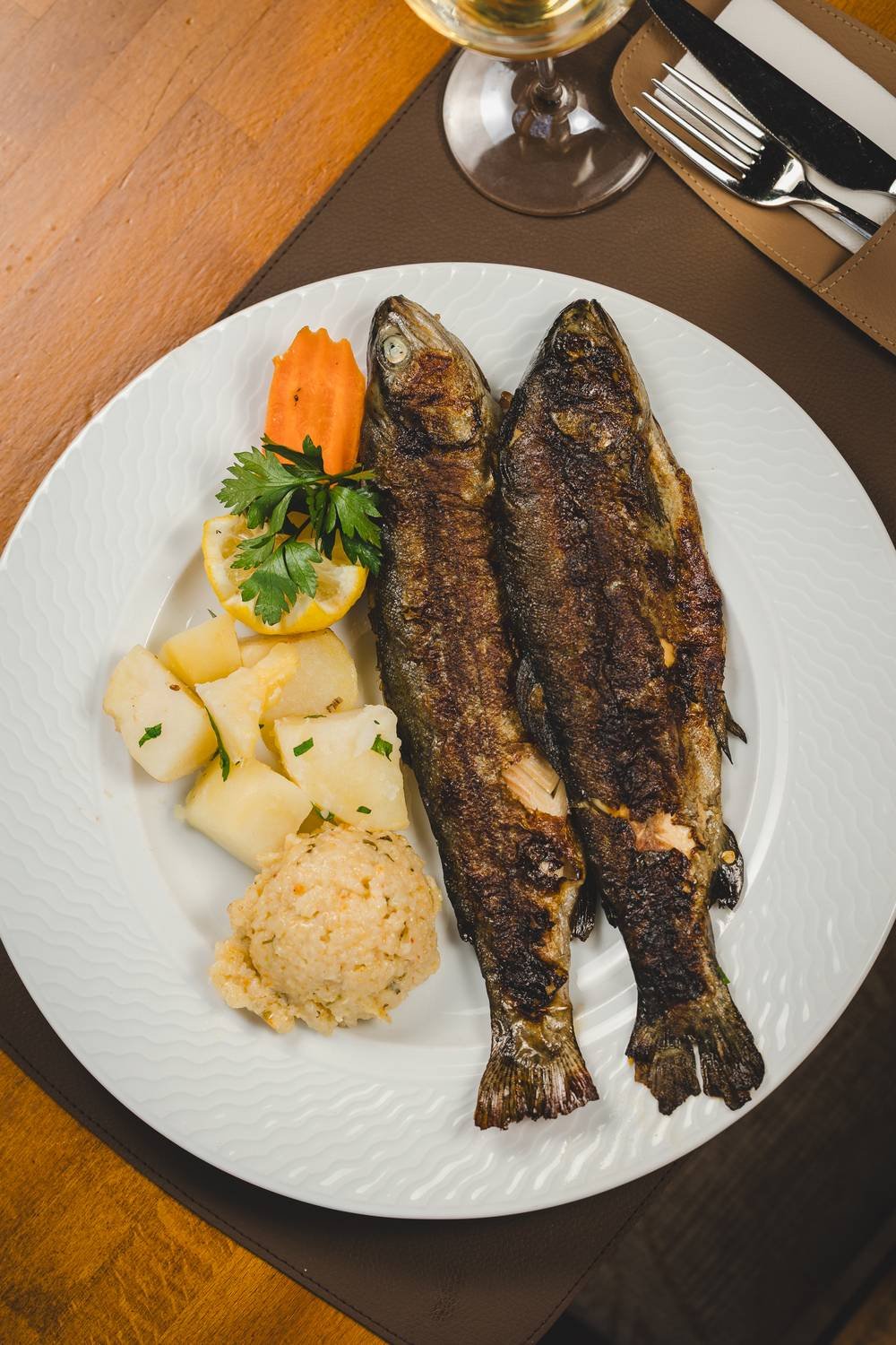 (pastrmka 600g, pastrmka na zvona 600g, šaran 600g, grilovano povrće 200g, riža, dalmatinsko varivo, pomfrit)